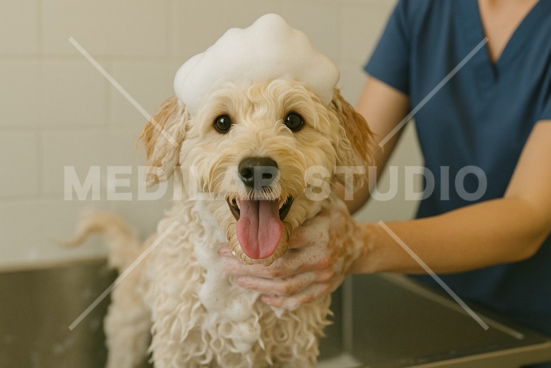 トリミングサロンでシャンプーしてもらっている犬。ごきげんな表情。