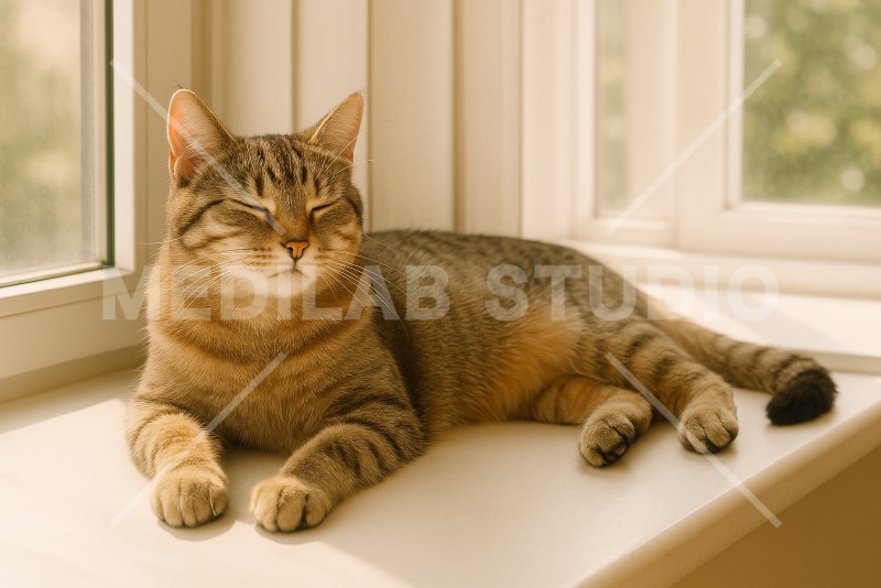 リビングの窓際でリラックスした様子で寝ている猫。穏やかな表情。