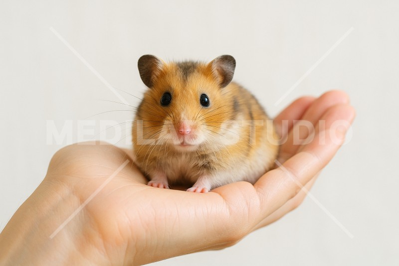 飼い主の手に乗っているゴールデンハムスター。きょとんとした表情が愛らしい。