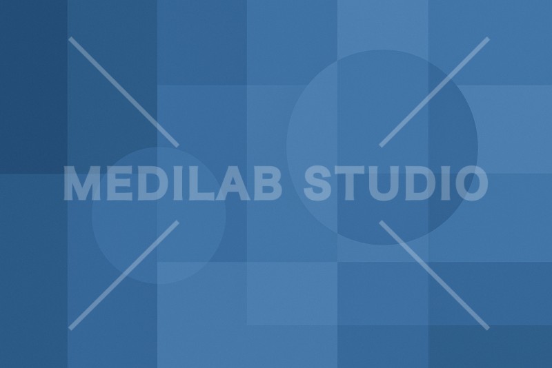 複数の青系統の長方形と円が重なり合い、バランスよく配置された構成が印象的なデジタルアート。シンプルながらも奥行きとリズムを感じさせる幾何学模様。