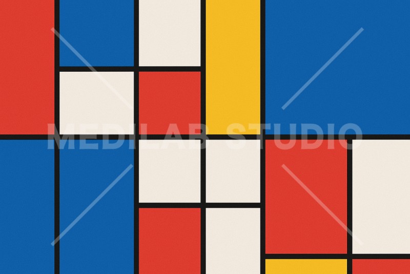 赤・青・黄・白が均整よく配置された幾何学模様のデザイン。 単純な形の組み合わせでありながら、力強いリズムと美しいバランスを感じさせる構成です。