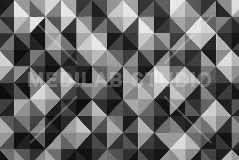 白から黒へと続く濃淡が織りなす、ピラミッド状の幾何学模様。 光と影のコントラストが奥行きを感じさせ、モノクロでありながら豊かな表情を見せるデザイン。