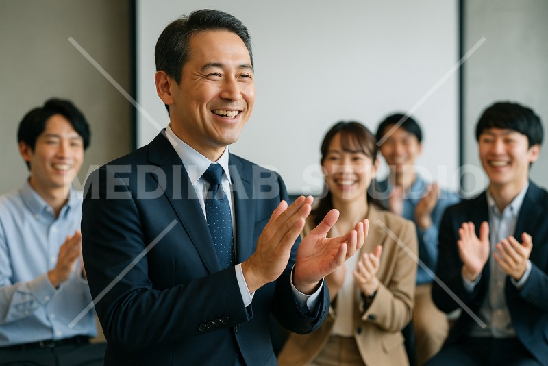 プレゼンテーションを聞いた後に拍手を送っている男性上司。50代くらい。