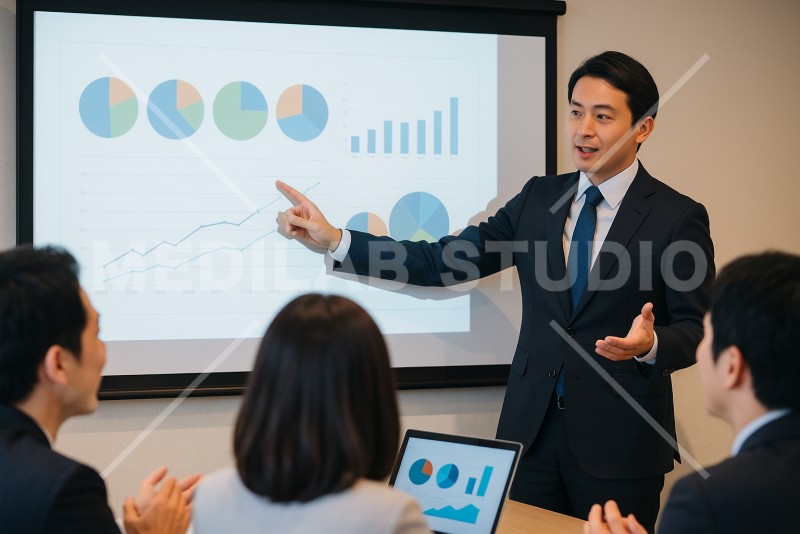 男性社員がプロジェクターを活用してプレゼンテーションしている様子。グラフの解説をしているイメージ。