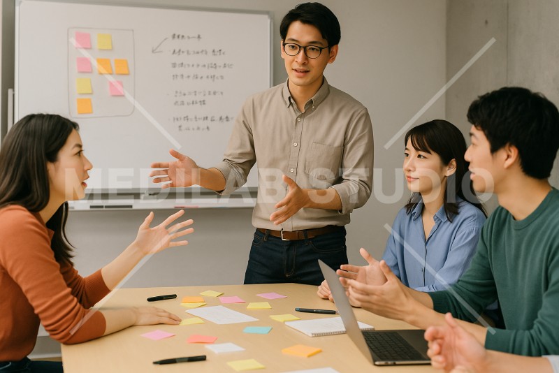 カジュアルな服装の社員たちがホワイトボードを囲んで議論している様子。活発に意見が飛び交っている。