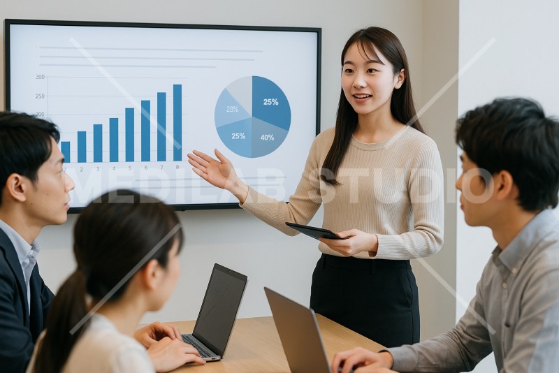 若手女性社員がプレゼンテーションをしている様子。グラフの解説をしているイメージ。
