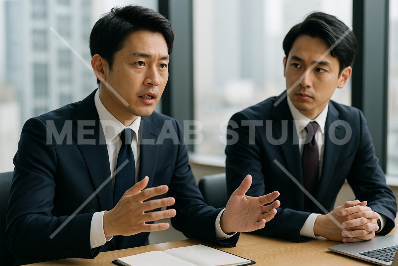男性社員が会議の場で真剣に意見を述べている様子