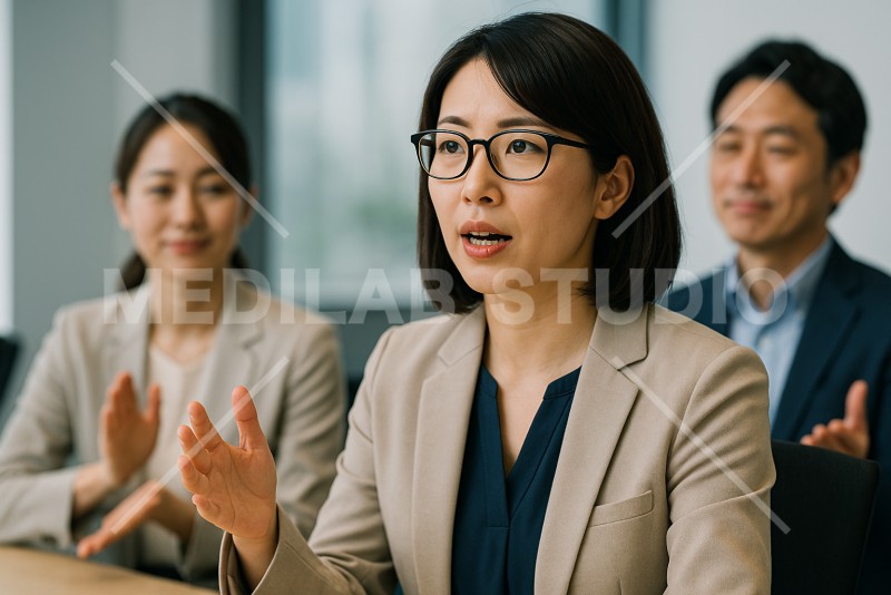 メガネをかけた女性中間管理職社員が、会議の場で自分の意見を述べている様子。