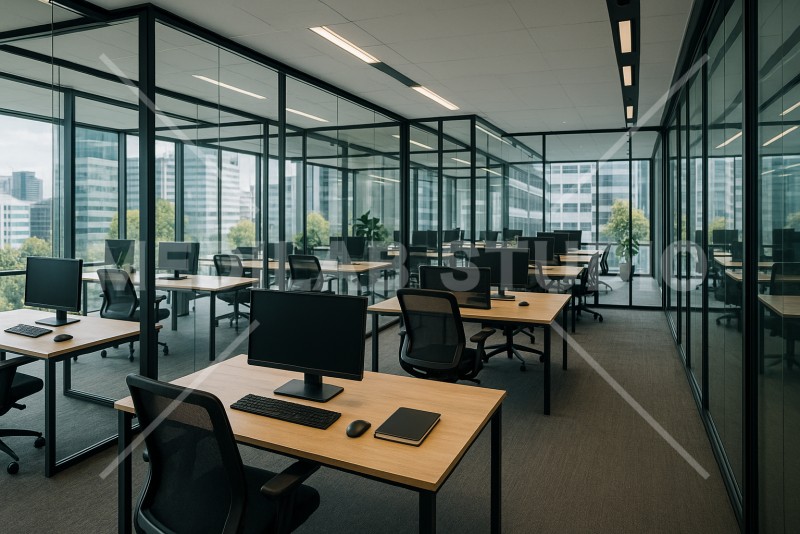 モダンな雰囲気のガラス張りオフィス。開放的なイメージ。