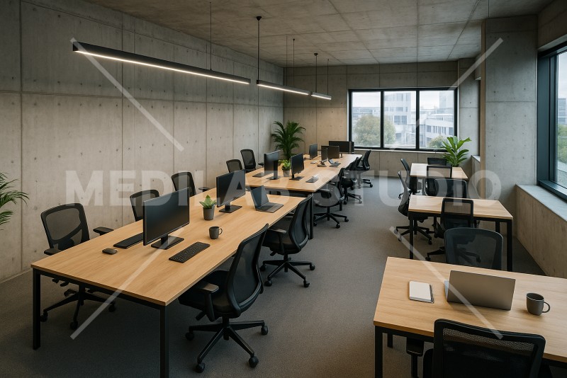 コンクリ打ちっぱなしのコンパクトな雰囲気のオフィス。スタートアップをイメージ。