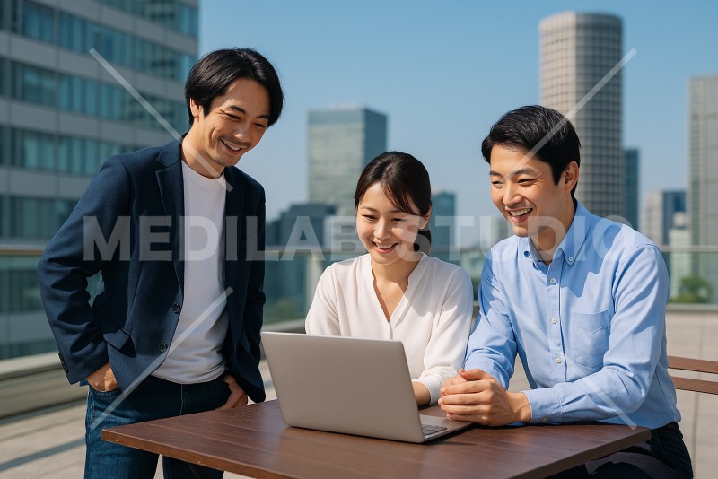 社員たちが自由に利用できるオフィスのバルコニー。社員たちがカジュアルな相談をしている様子。