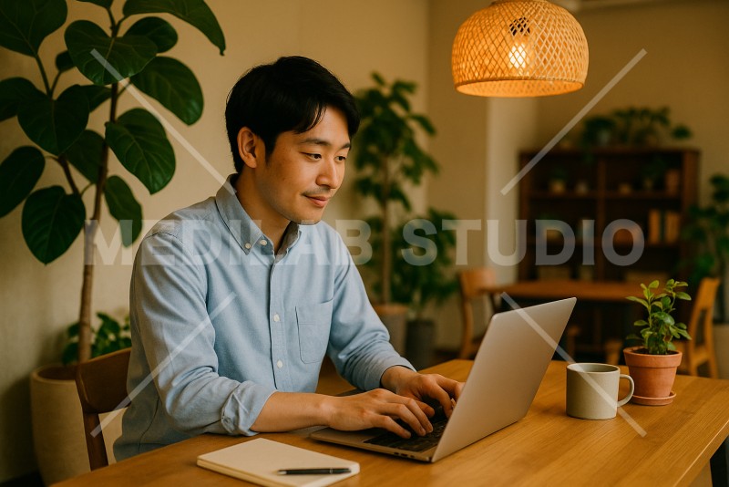 観葉植物がある温かい雰囲気のオフィスで社員が仕事をしている風景。