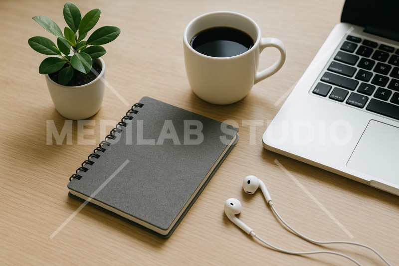 カジュアルなオフィスのデスク上の様子をイメージ。小さな観葉植物とコーヒーでリラックスできるイメージ。