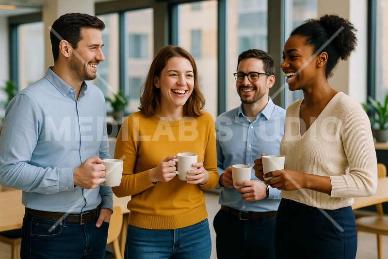 社員たちが休憩時間に談笑している、和やかな雰囲気のオフィス風景イメージ。
