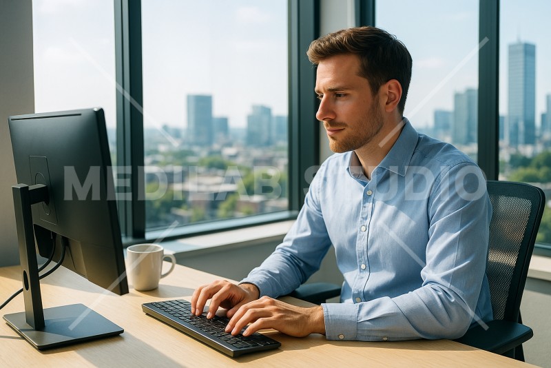 高層ビルの中にあるオフィス。窓際の席で男性外国人社員が作業をしている様子。