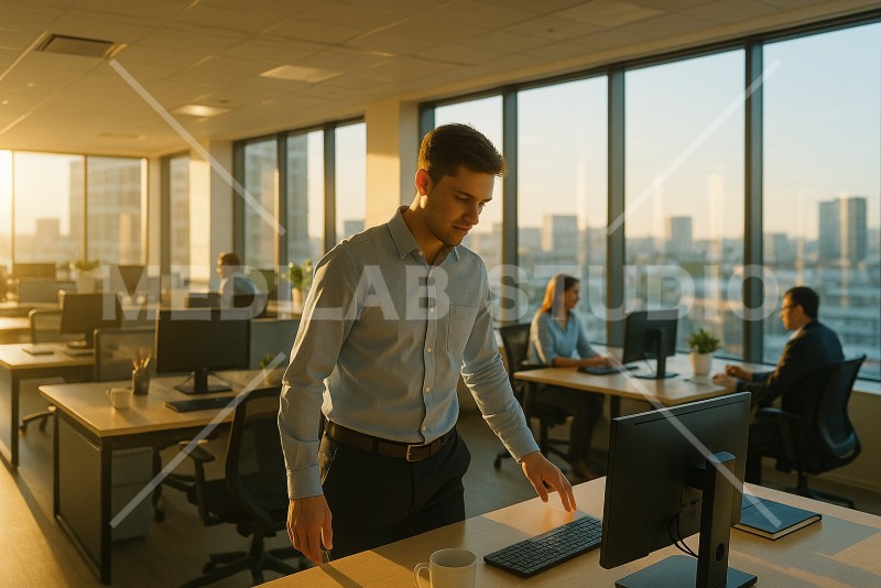 朝方のオフィスの社員たちが集まってくる様子。静かなイメージ。