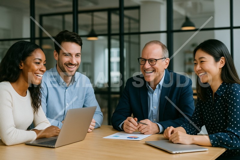 外国人と日本人が笑顔で話し合うチームワークの良い職場