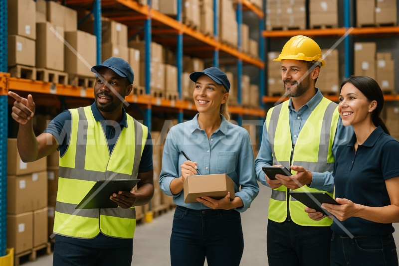 配送サービス系職場で社員たちがチームワークよく働く様子