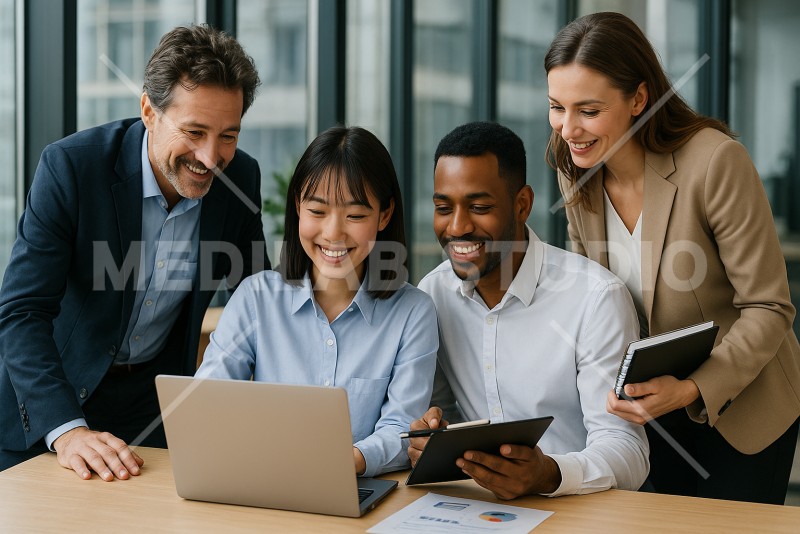 女性若手社員が作成した資料を先輩たちが確認。和やかな雰囲気でアドバイスする様子でチームワークのよさを感じる。