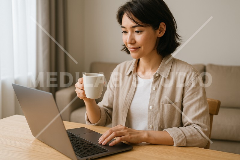 若手女性社員が、自宅でモーニングコーヒーを飲みながら勤務開始する様子。