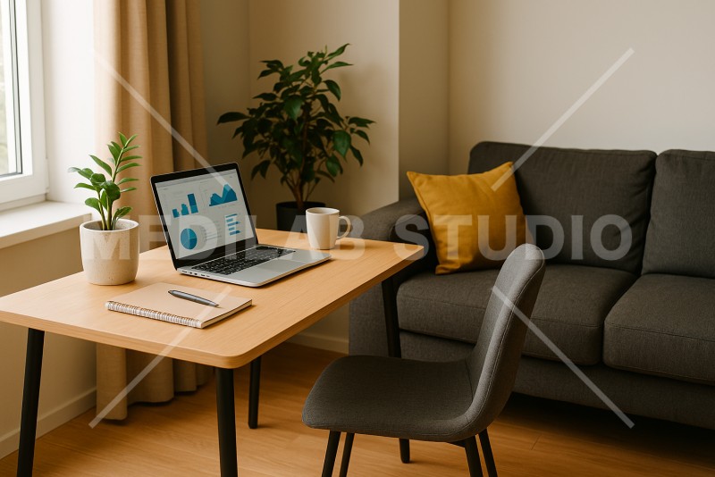自宅でリモートワークをしている人のデスク周りの様子をイメージ。