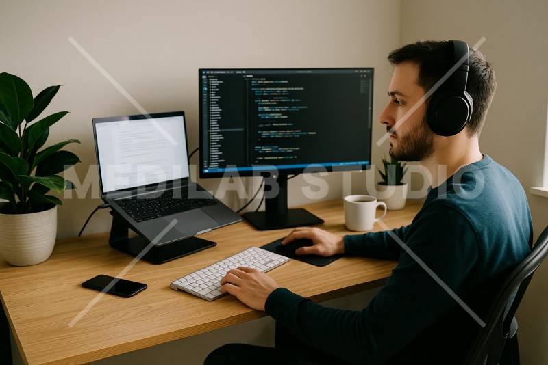 自宅でリモートワークしている外国人エンジニア男性。ノートパソコンとモニターを使用して作業中。