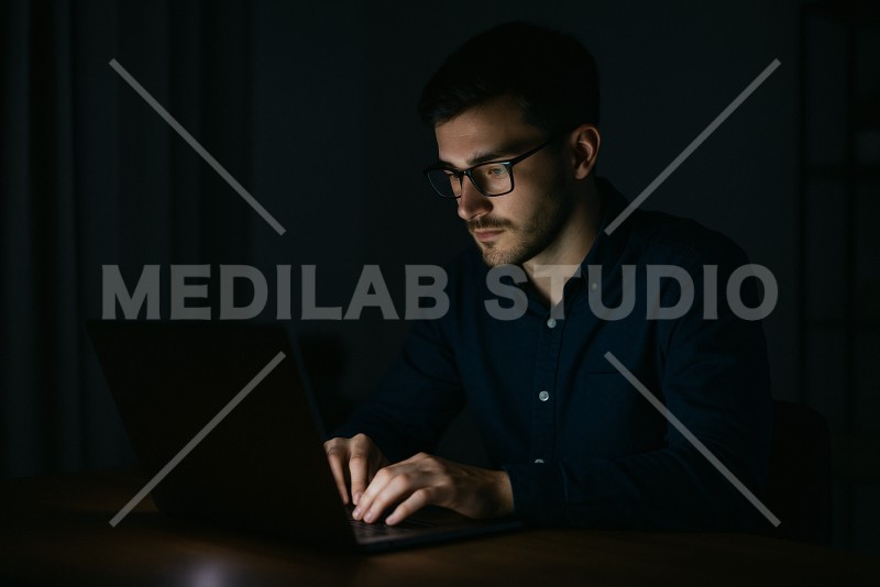 自宅でリモートワークしている眼鏡をかけた男性社員