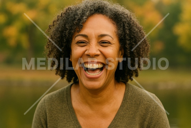 外国人女性のダイナミックな笑顔です。褐色系人種でドレッド風ヘア。