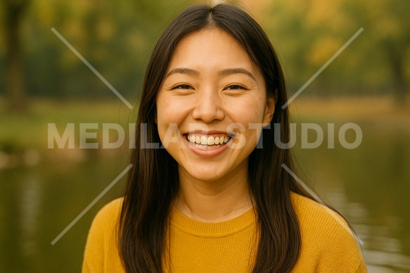 健康的な雰囲気の黒髪長髪の女性がカメラに向かって笑顔を向ける様子。