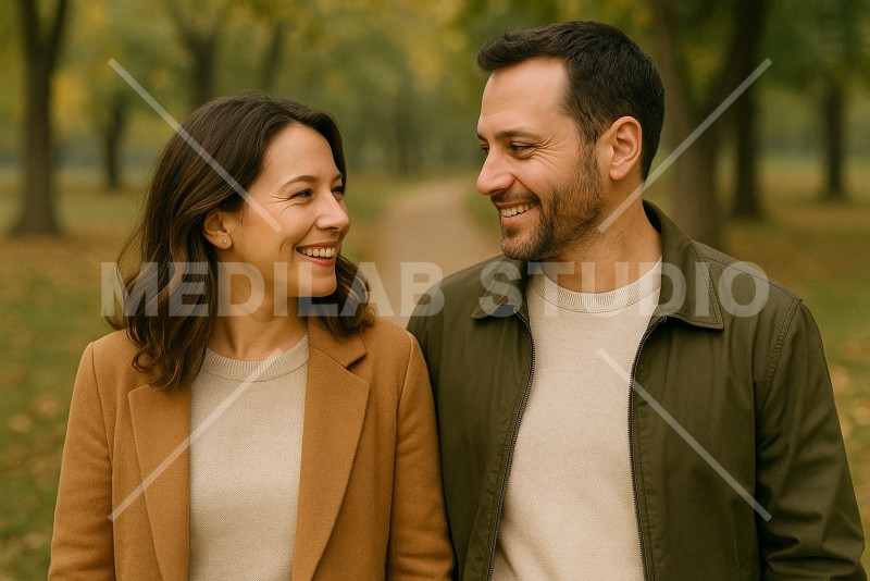 外国人の40代くらいのカップルが、お互いに微笑みを交わしている様子。