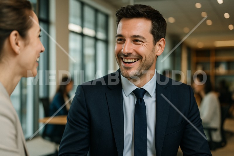 ビジネスマンが同僚との会話で笑顔を浮かべる様子