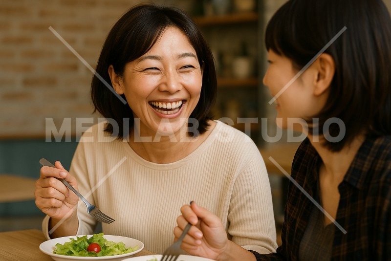 ママ友とランチに出かけた女性が楽しい会話で笑顔を浮かべている様子。