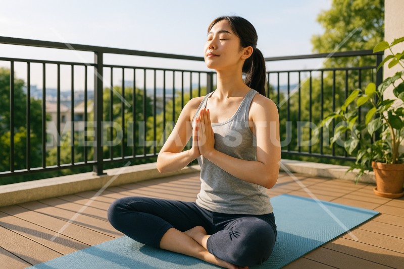 趣味として朝ヨガを楽しんでいる女性。自宅のバルコニーで気持ちよさそうに取り組んでいる様子。