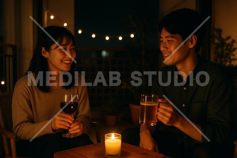夜間、おしゃれなダイニングバーでお酒を楽しんでいる男女。親しい雰囲気。