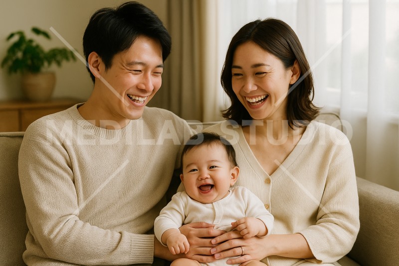 赤ちゃんとパパ・ママがリビングで笑顔を浮かべている様子。赤ちゃんも満面の笑み。