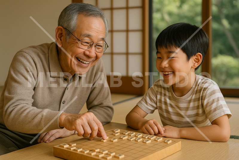おじいちゃんと将棋で遊んでいる男の子。双方が笑顔で楽しそうな雰囲気。
