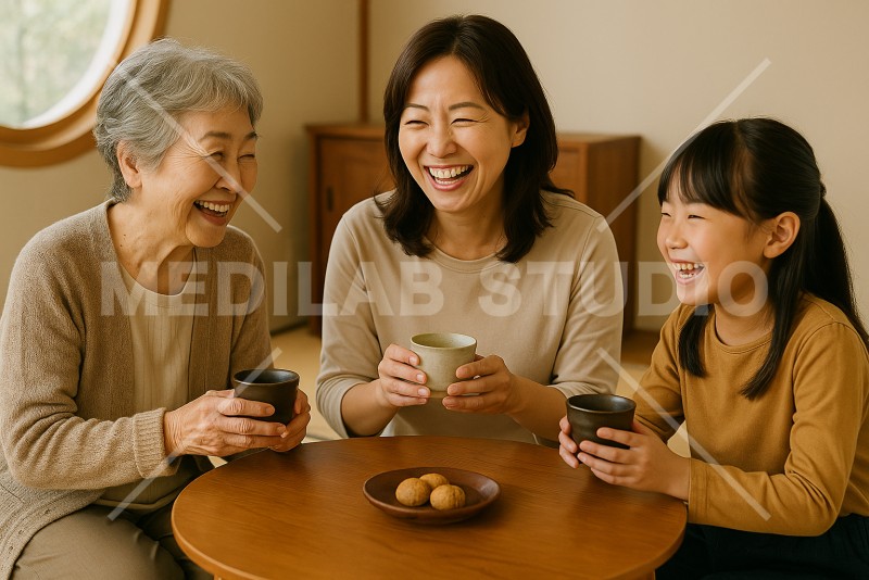 おばあちゃんの家を訪ねてきた母子が楽しく過ごしている様子。女性3人が談笑している雰囲気。