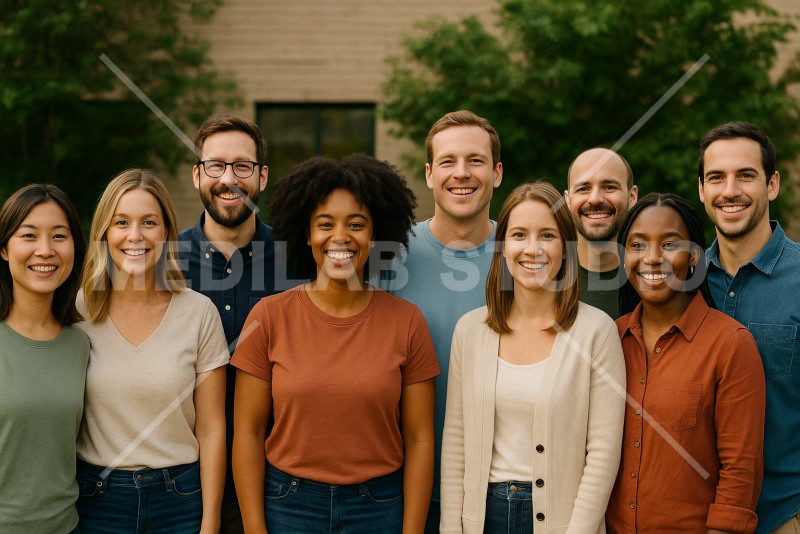 大学のサークルグループをイメージした集合写真。笑顔のメンバーたち。