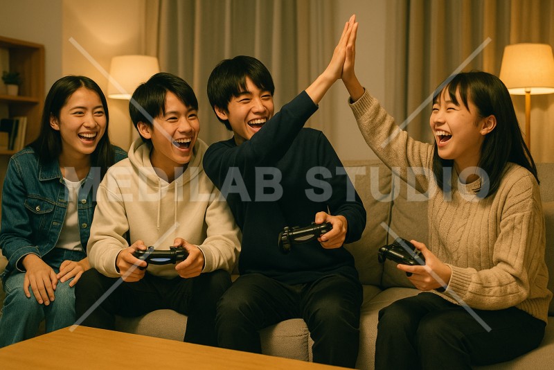 日本人高校生の友人グループがテレビゲームで盛り上がる様子
