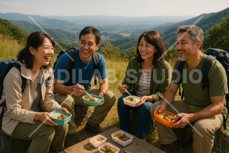 ハイキングに出かけた50代の友人グループがお弁当を食べながら休憩している様子。