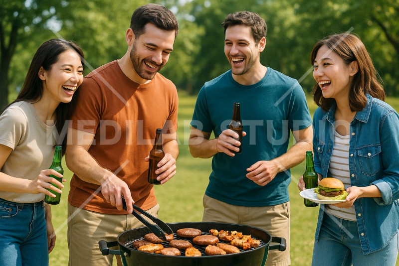 バーベキューを楽しんでいる若者グループ。男女4人グループ。