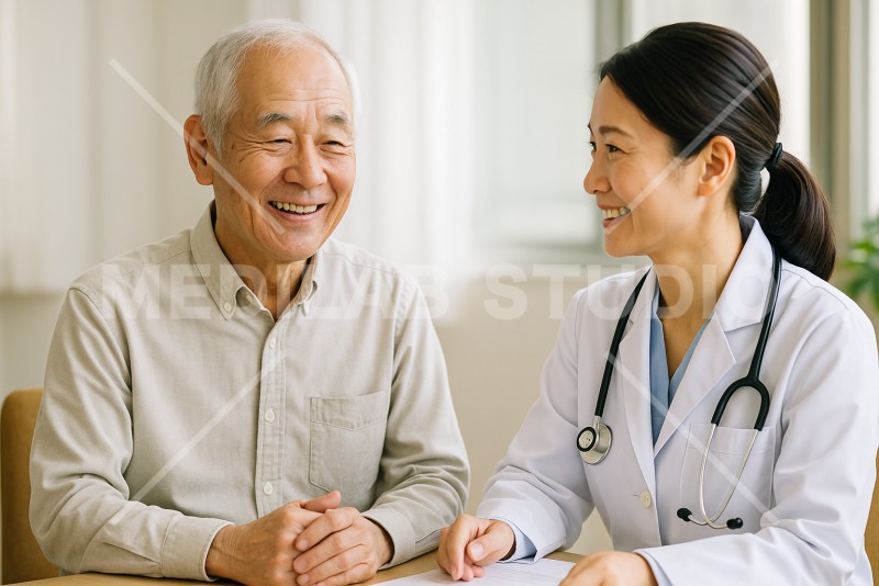 女医に健康相談をしているシニア男性。ほほ笑みを浮かべていて和やかな雰囲気。