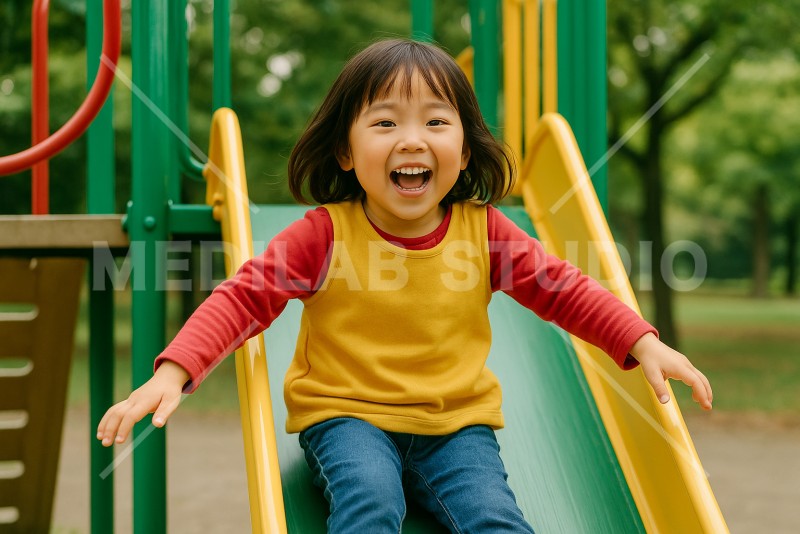 滑り台で楽しそうに遊んでいる幼児。公園で楽しく過ごしている日常のイメージカット。