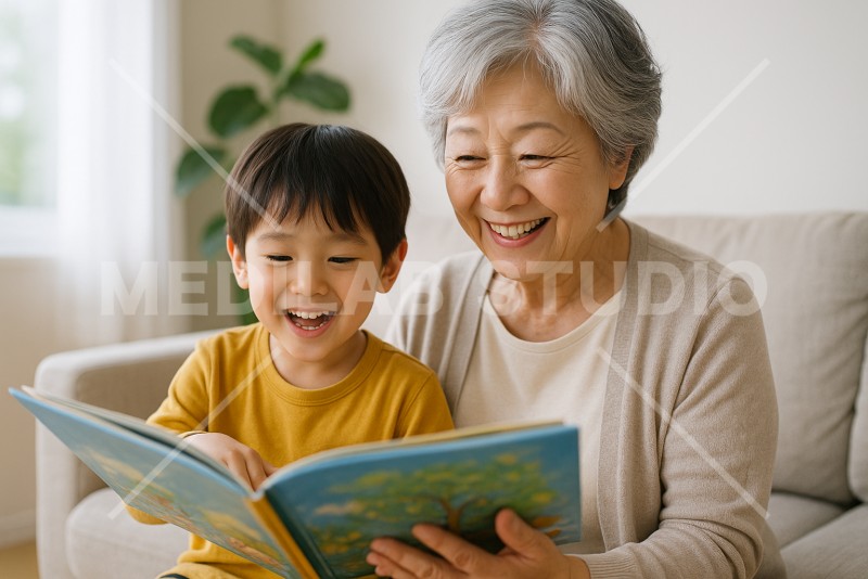 おばあちゃんと孫。絵本の読み聞かせで孫が楽しんでいる日常シーンのイメージ。