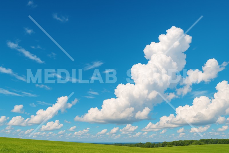 良く晴れた夏の青空に大きく真っ白な入道雲が浮かんでいる様子。穏やかな夏の昼間の風景。