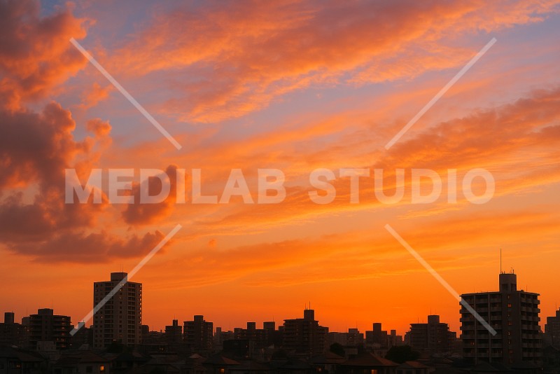 都会のビル街に夕焼け空がかかっている様子。真っ赤な夕焼けがシルエットに映えている。