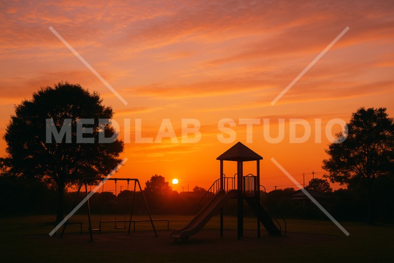 子どもたちが遊んだ後の公園が夕焼け空に包まれる様子。真っ赤な空と公園のシルエットが映える。