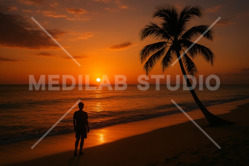 穏やかな日のビーチで、夕日が沈む様子を眺める男性。エモーショナルな風景。