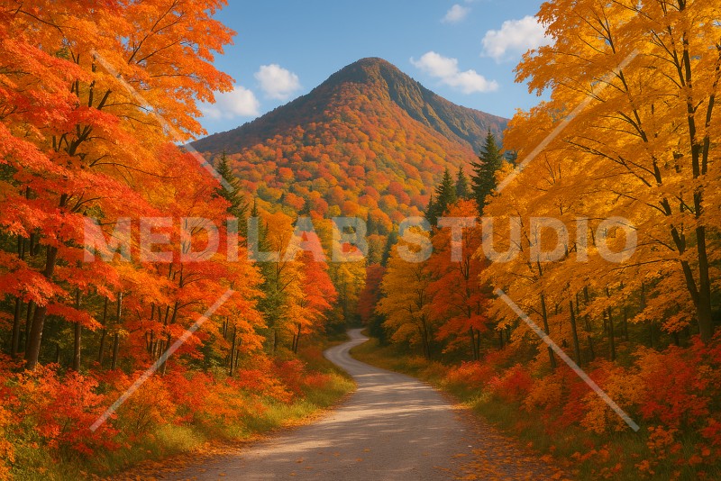 真っ赤な紅葉が美しい雄大な山の風景。真っ赤なモミジが青空に映えている。