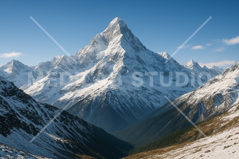 荘厳な冬の山に、雪がかかっている様子。厳しさと美しさを両立する自然の魅力を表現。